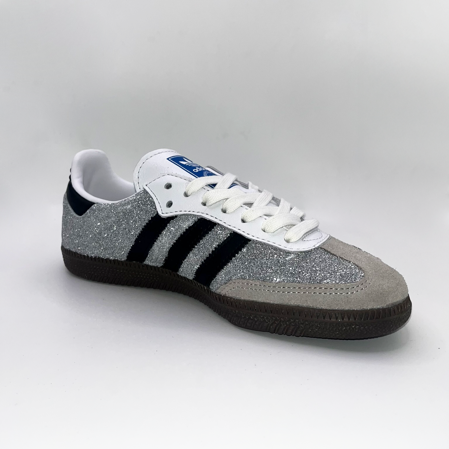 Icónico Modelo (Adidas Samba) reinventado, añadiendo purpurina plateada por toda la silueta cambiando así su apariencia por completo y aportando elegancia a la silueta.